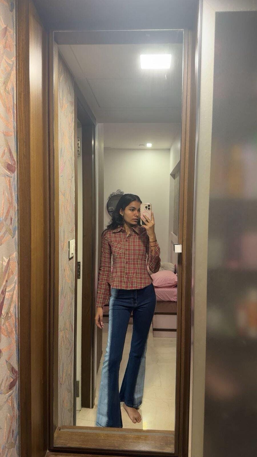 Fit: High-waisted, slim through thighs, wide flared legs with contrast side paneling