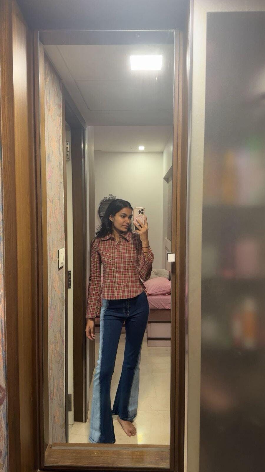 Two-tone flared jeans designed in stretch denim for all-day comfort and a modern edge. Featuring a high-rise waist and a slim fit through the hips and thighs that opens into a dramatic flare. The contrasting dark and light wash paneling along the sides adds a bold, elongating effect. Finished with classic five-pocket styling, belt loops, button-zip closure, and a leather brand patch at the back for a signature denim touch.